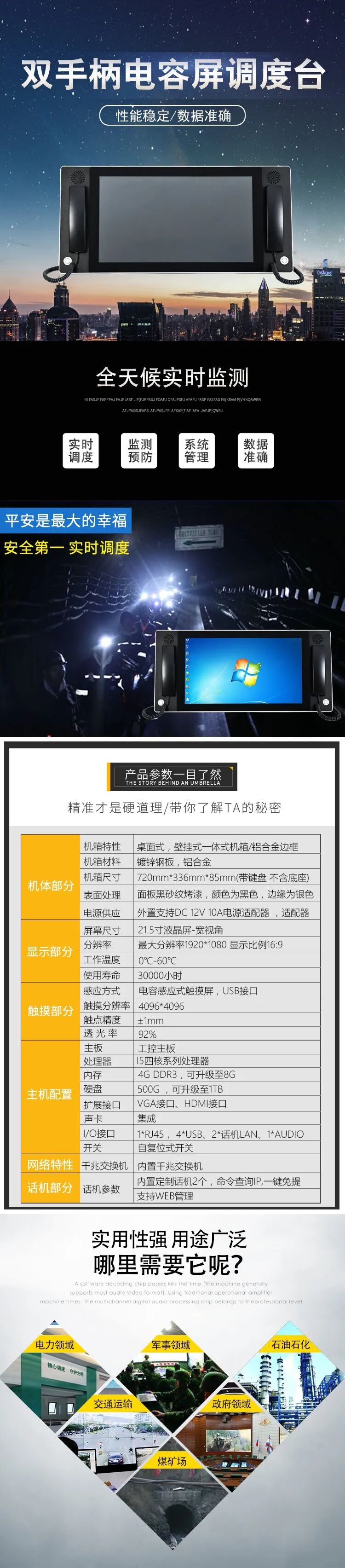 U200-IDS触摸调度台 是一款为统一应急指挥调度系统而设计的21.5寸全高清1080P LED显示屏,工业级电容触摸屏,最高支持I7的高性能指挥调度台,左右各内嵌高品质IP话机联动设计。提供可视化图形调度界面,调度用户状态一目了然,为用户提供高效率的调度操作手段,便于进行准确决策和快速指挥。